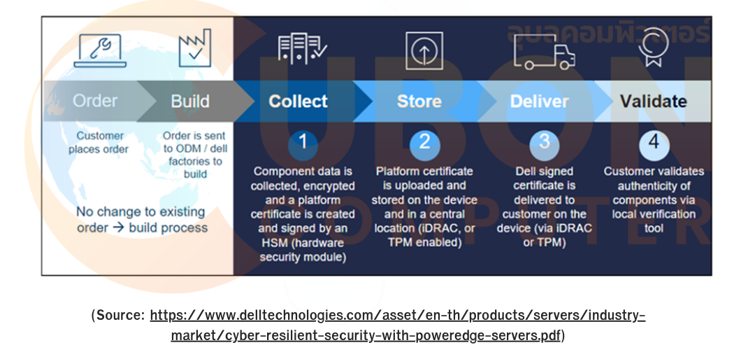 4. ความปลอดภัยขั้นสูง: Dell PowerEdge Server R750 มีการรักษาความปลอดภัยของอุปกรณ์ตั้งแต่ขั้นตอนการผลิต โดย Dell Technologies ให้ชื่อขั้นตอนนี้ว่า Secured Componebt Verification (SCV) ซึ่งก็คือกระบวนการควบคุมการผลิตอุปกรณ์ที่มีการสั่งซื้อจาก Dell Technologies จากโรงงานจนถึงมือลูกค้าว่าจะมีการรักษาความปลอดภัยของอุปกรณ์โดยใช้กระบวนการ Cryptographically Verified Hardware ซึ่งจะให้ความมั่นใจลูกค้าได้ว่าอุปกรณ์ที่สั่งซิ้อจากทาง Dell Technologies จะไม่มีการเปลี่ยนแปลงหรือปรับเปลี่ยนสอดแทรกอุปกรณ์อื่นมาติดตั้งบนอุปกรณ์ ในส่วนนี้จะทำให้ธุรกิจมีความมั่นใจในการใช้ผลิตภัณฑ์จาก Dell Technologies นอกจากนี้ Dell PowerEdge Server R750 ยังมาพร้อมกับ TPM 1.2, TPM 2.0, Intel(R) TXT, Intel(R) SGX, Memory Encryption, Secure Boot และ Features อื่นๆ ซึ่งจะให้ความมั่นใจลูกค้าได้ว่า Dell PowerEdge Server R750 จะมาพร้อมกับตัวช่วยที่ทำให้ลูกค้ามีการใช้งาน Server (เซิร์ฟเวอร์) ได้อย่างปลอดภัย