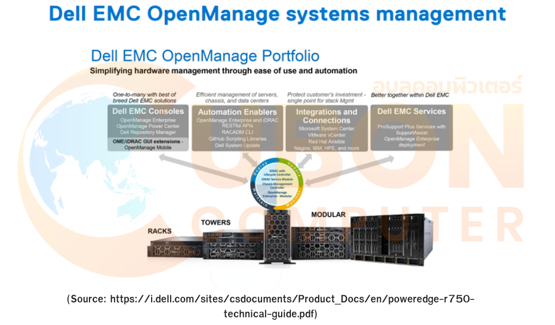 5. การจัดการทรัพยากรที่เชื่อถือได้: Dell PowerEdge Server R750 มาพร้อมกับ Software สำหรับบริหารจัดการที่คิดค้นโดยทาง Dell Engineer ที่มีชื่อว่า Dell OpenManage System Management ด้วยระบบบริหารจัดการ (Lifecycle Management) ที่มาใน OpenManage ทำให้ผู้ดูแลระบบสามารถดูแลและปรับแต่งการใช้งานต่างๆ ได้อย่างมีประสิทธิภาพมากขึ้น ซึ่งมาพร้อมกับความสามารถในการบริหารจัดการแบบอัตโนมัติ (Automation Enabler)