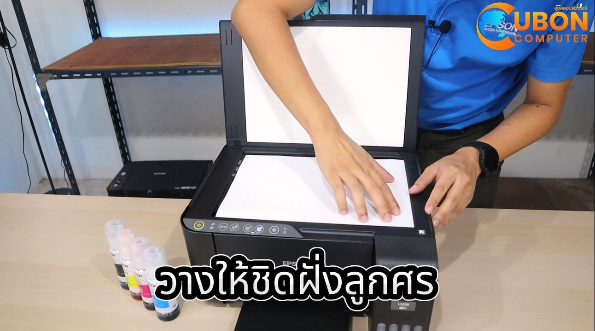 1. วางกระดาษให้ชิดฝั่งลูกศรและทำการปิดฝาลง