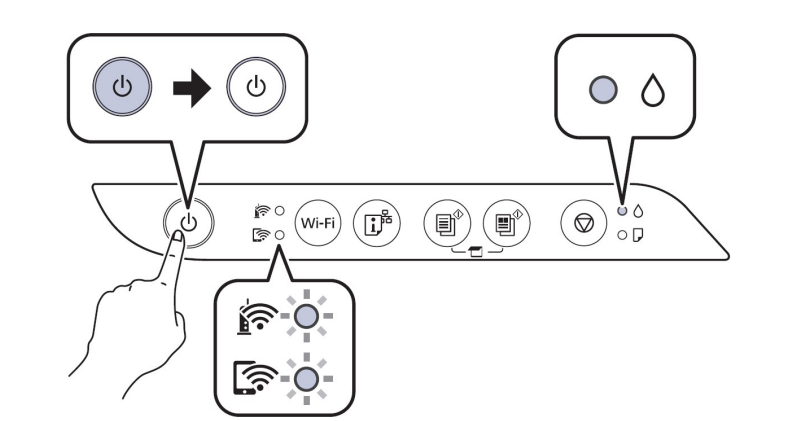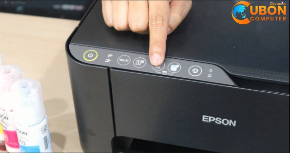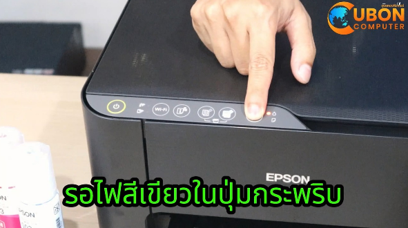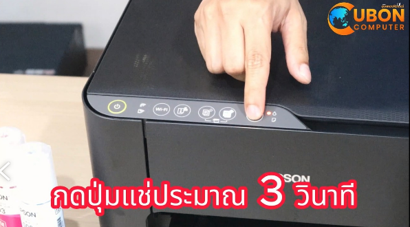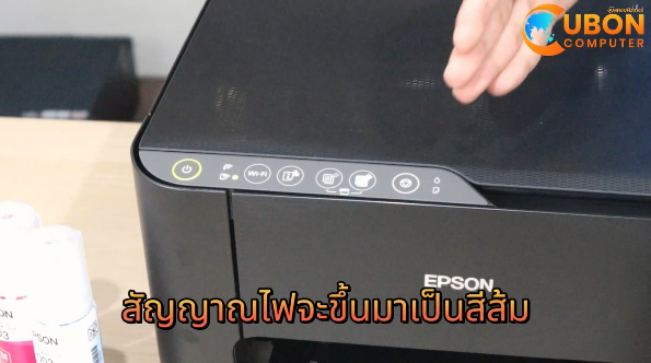 2. หลังจากเติมหมึกให้เครื่องปริ้นเตอร์เรียบร้อยแล้ว ให้เสียบสายไฟให้ปริ้นเตอร์ เปิดปุ่มเปิดเครื่อง รอสัญญาณไฟจะขึ้นมาเป็นสีส้ม ต่อมากดปุ่มแช่ประมาณ 3 วินาที รอจนไฟสีเขียวกระพริบ จากนั้นเครื่องจะทำการดูหมึกปริ้นเตอร์เข้าไปในหัวพิมพ์อัตโนมัติโดยใช้เวลาประมาณ 11 นาที หลังจากเติมหมึกเสร็จไฟจะขึ้นมาเป็นสีเขียวคือ สถานะพร้อมใช้งานแล้ว
