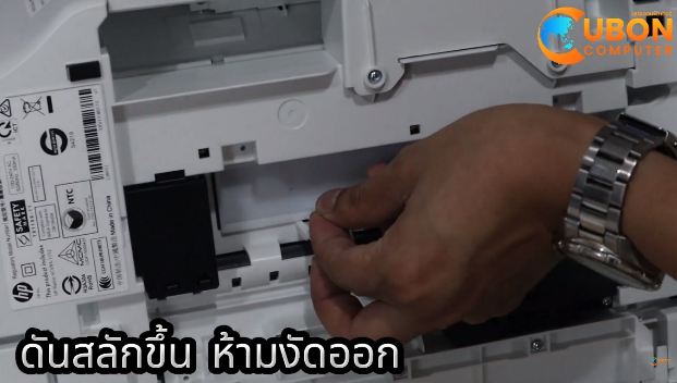 - อันดับแรกให้ปิดเครื่องปริ้น ให้ยกเครื่องปริ้นขึ้นด้านใต้เครื่อง ดันสลักขึ้น ห้ามงั้นออก