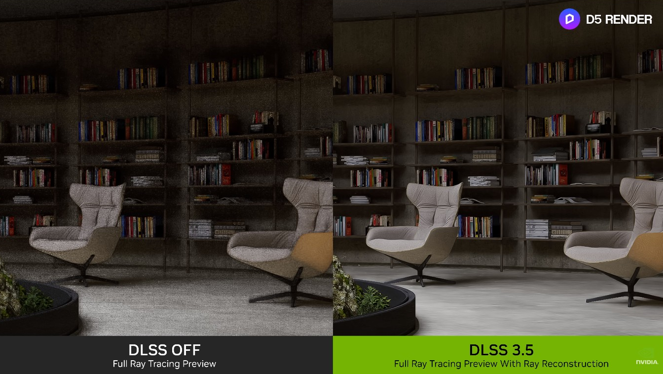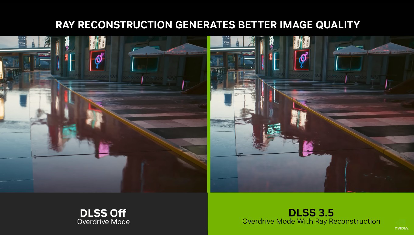 ตัวอย่างเช่นเปรียบเทียบ การปิด DLSS กับ DLSS 3.5 จะเห็นว่า DLSS ลดภาพซ้อนและปรับปรุงแสงแบบไดนามิก จะมองเห็นภาพสะท้อนได้คมชัดยิ่งขึ้นมากโดยใช้การสร้างใหม่ด้วยรังสี แม้ในขณะเคลื่อนไหวแอปพลิเคชั่นครีเอทีฟมีเนื้อหาที่หลากหลาย สำหรับผู้ใช้งานที่ลดนอยส์แบบเดิมเนื่องจากต้องมีการปรับแต่งด้วยมือในแต่ละฉาก ด้วยเหตุนี้จะทำให้ได้รับคุณภาพของภาพที่ไม่ดีนัก