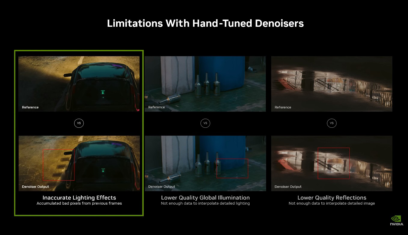 การสร้างใหม่ของเรย์นั้นฉลาดกว่าตัวนอยส์เซอร์ AI ของ DLSS ได้รับการฝึกฝนเกี่ยวกับชุดข้อมูลขนาดใหญ่ของรูปภาพที่สร้างขึ้นโดยกระบวนการเรนเดอร์ออฟไลฟ์ โดยมีการคำนวณที่มากกว่าที่จะพร้อมใช้งานแบบเรียลไทล์ จากนั้น AI จะจดจำรูปแบบบางอย่างที่สอดคล้องกับเอฟเฟกต์ เช่น Global lllumination และใช้ข้อมูลจากกระบวนการฝึกอบรมเพื่อสร้างภาพที่สมจริงและมีชีวิตชีวามากขึ้น การสร้าง DLSS Ray ใหม่จะสร้างรูปภาพ Ray Traced คุณภาพสูงขึ้น