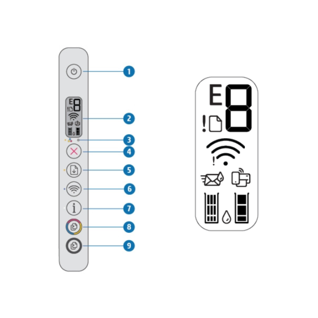 - หน้าจอแผงควบคุม แสดงจำนวนสำเนา สถานะระบบไร้สายและความแรงของสัญญาณ สถานะ Wi-Fi Direct คำเตือนหรือข้อผิดพลาด และระดับหมึก