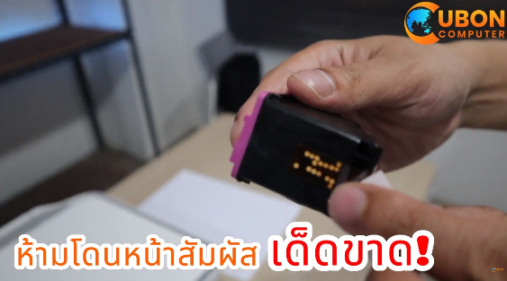 ห้ามโดนหน้าสัมผัสเด็ดขาด ใส่ตลับหมึกลงไปในฐานตลับหมึก ปิดฝาตลับหมึก