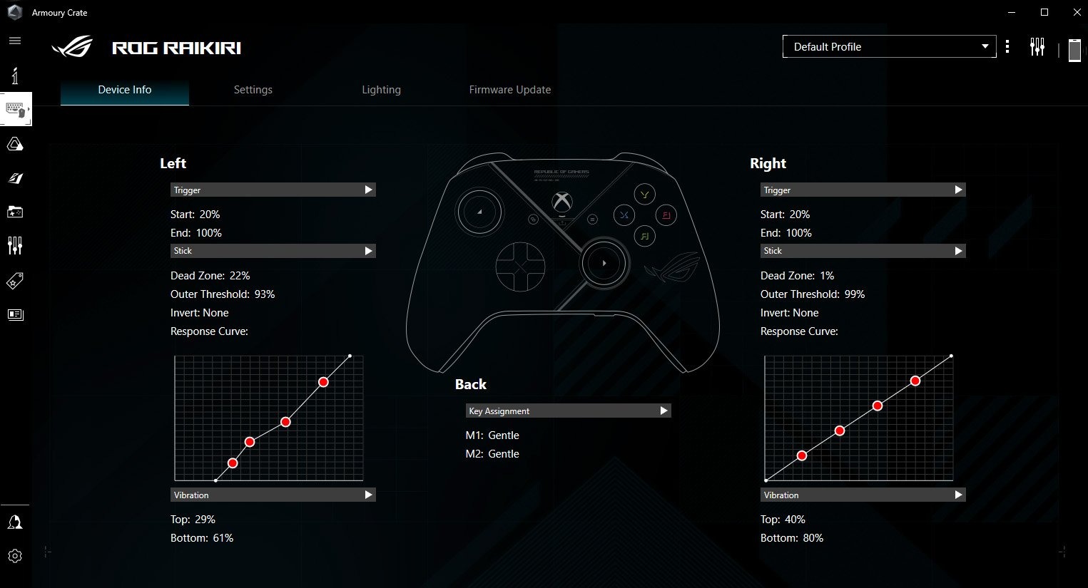 สำหรับตัวบอดี้ของคอนโทรลเลอร์ ROG Raikiri ค่อนข้างจะพรีเมี่ยมกันเลยทีเดียว ตัวเครื่องมาพร้อมสีดำ มีไฟ RGB Aura ตามสไตล์ของ ROG วัสดุของตัวเครื่องเป็นพลาสติกทั้งหมด มีปุ่มฟังก์ชันทั้งหมด 13 ปุ่มด้วยกัน Control 11 ปุ่ม Marco 2 ปุ่ม สำหรับปุ่มควบคุมสามารถใช้งานได้ง่ายโดยใช้ Triggers เพื่อสลับโปรไฟล์คอนโทรลเลอร์ระหว่างเกมทั้งซ้ายและขวา สามารถปรับการตั้งค่าเป็นระยะสั้นหรือโหมดเต็มช่วง ซึ่งการปรับระยะนี้ก็เพื่อที่จะให้เข้ากับเกมที่ผู้ใช้งานเล่น เช่น Triggers ระยะกดสั้นเหมาะกับเกมแนวยิง ส่วนTriggers แบบระยะยาวเหมาะกับเกมเร่งจังหวะ อาทิ เกมแข่งรถ ฯลฯ และนอกจากนี้ ROG Raikiri ยังรองรับ AUX 3.5 mm สำหรับใช้เสียบหูฟังและมีปุ่ม Mute พร้อม Sound Card ESS DAC ไม่ต้องกังวลเรื่องเสียง ช่วยให้การขับเสียงออกมาได้ดี และอีกความพิเศษที่น่าใช้งานของ ROG Raikiri คือ สามารถปรับแต่งปุ่มกดต่างๆ เช่น Remap, shift ความไว, แสง RGB Aura ได้ผ่าน Application Armory Crate PC ของ Asus ตามความต้องการของผู้ใช้งานได้อีกด้วย