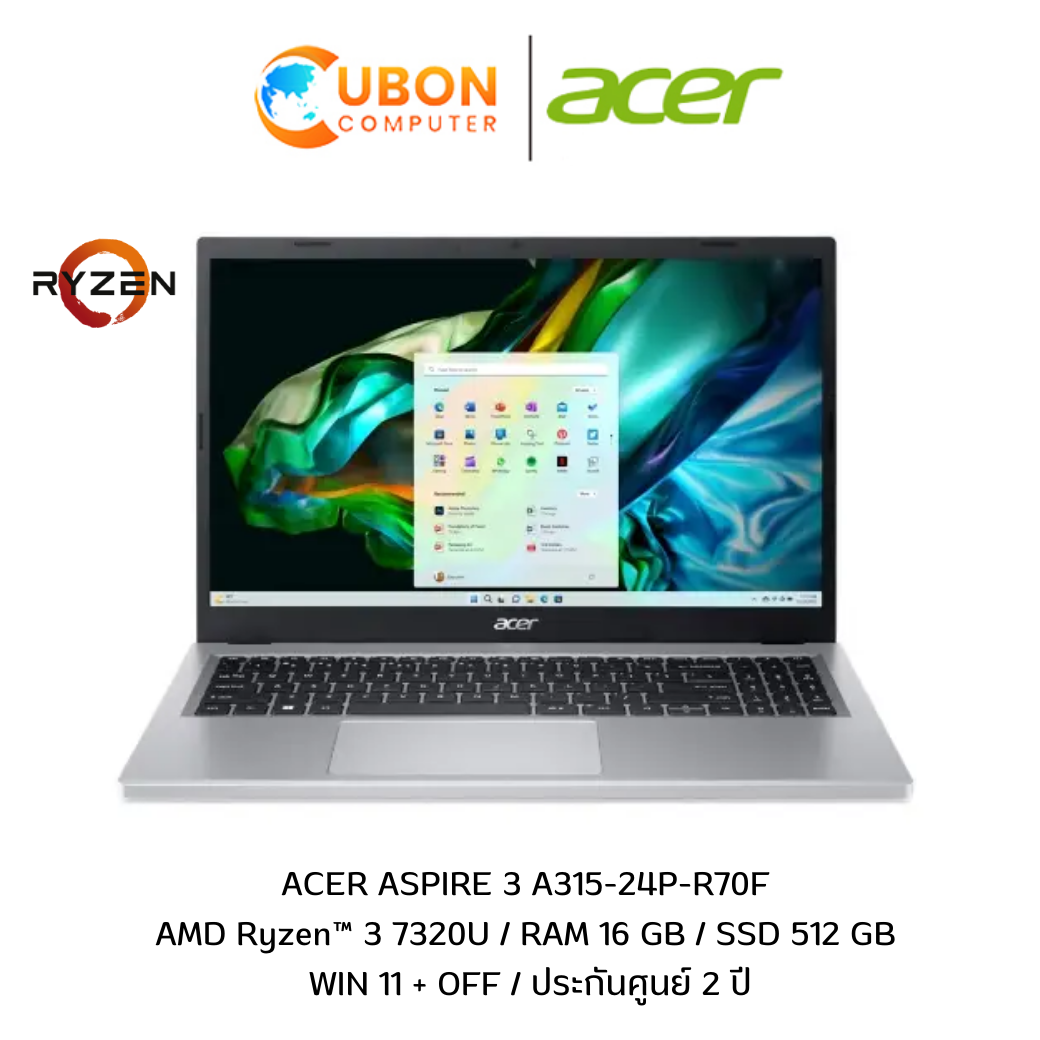 ACER ASPIRE 3 A315-24P-R70F NOTEBOOK (โน้ตบุ๊ค) AMD RYZEN 3 7320U / RAM 16 GB / SSD 512 GB / WIN11+OFF/ ประกันศูนย์ 2 ปี (Pure Silver)