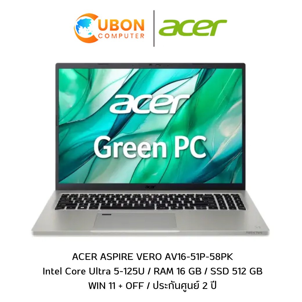 ACER ASPIRE VERO AV16-51P-58PK NOTEBOOK (โน้ตบุ๊ค) Intel Core Ultra 5-125U / 16 GB / 512 GB / WIN 11 + OFF / ประกันศูนย์ 2 ปี