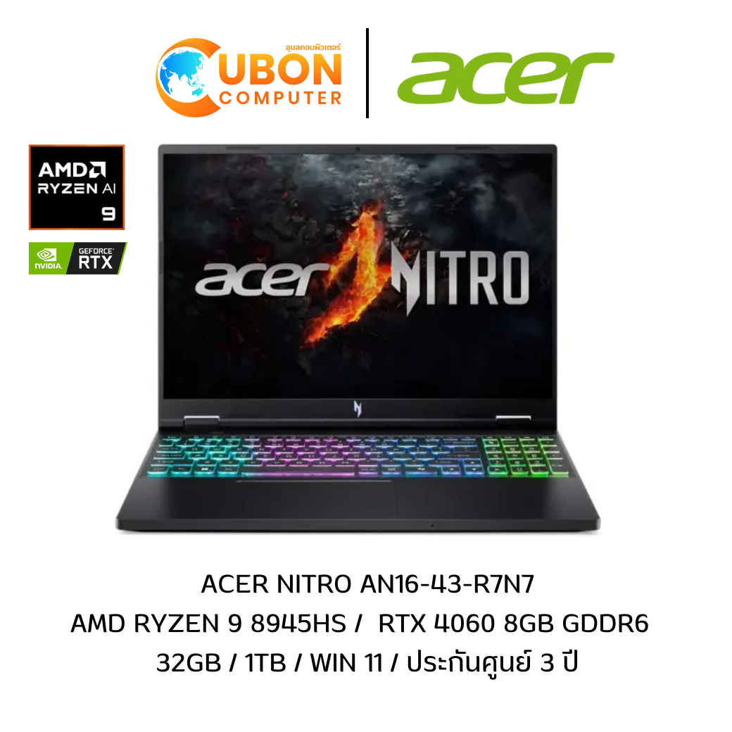 ACER Nitro AN16-43-R7N7 NOTEBOOK (โน็ดบุ๊ค) AMD Ryzen 9 8945HS / 32GB / 1TB / RTX 4060 8GB GDDR6 / WIN11 / ประกันศูนย์ 3 ปี