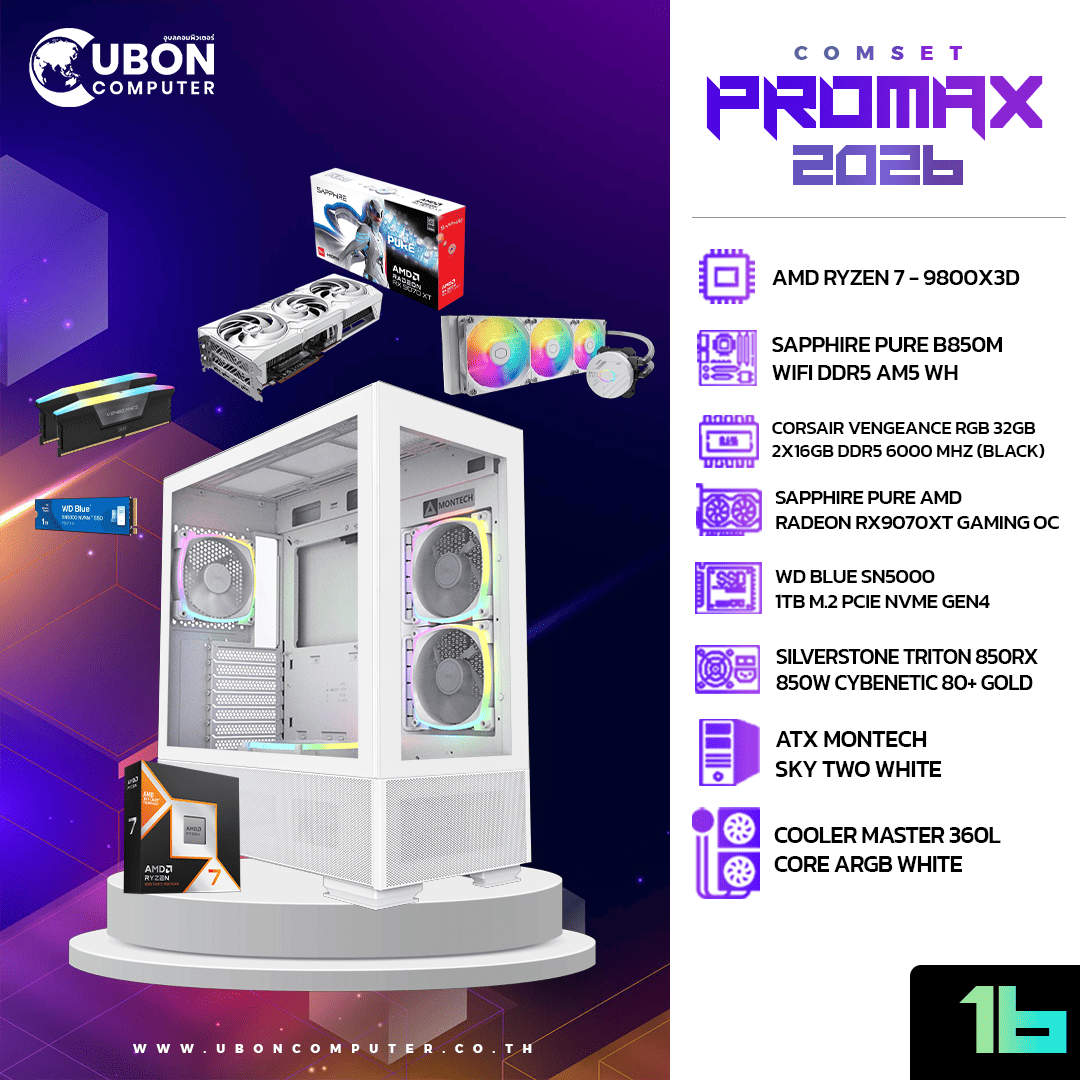 COMSET (คอมประกอบ) PROMAX 16 AMD RYZEN 7 9800X3D / RX9070XT OC / DDR5 6000 MHZ 32GB / M.2 1TB / 850W CYBENETIC 80+