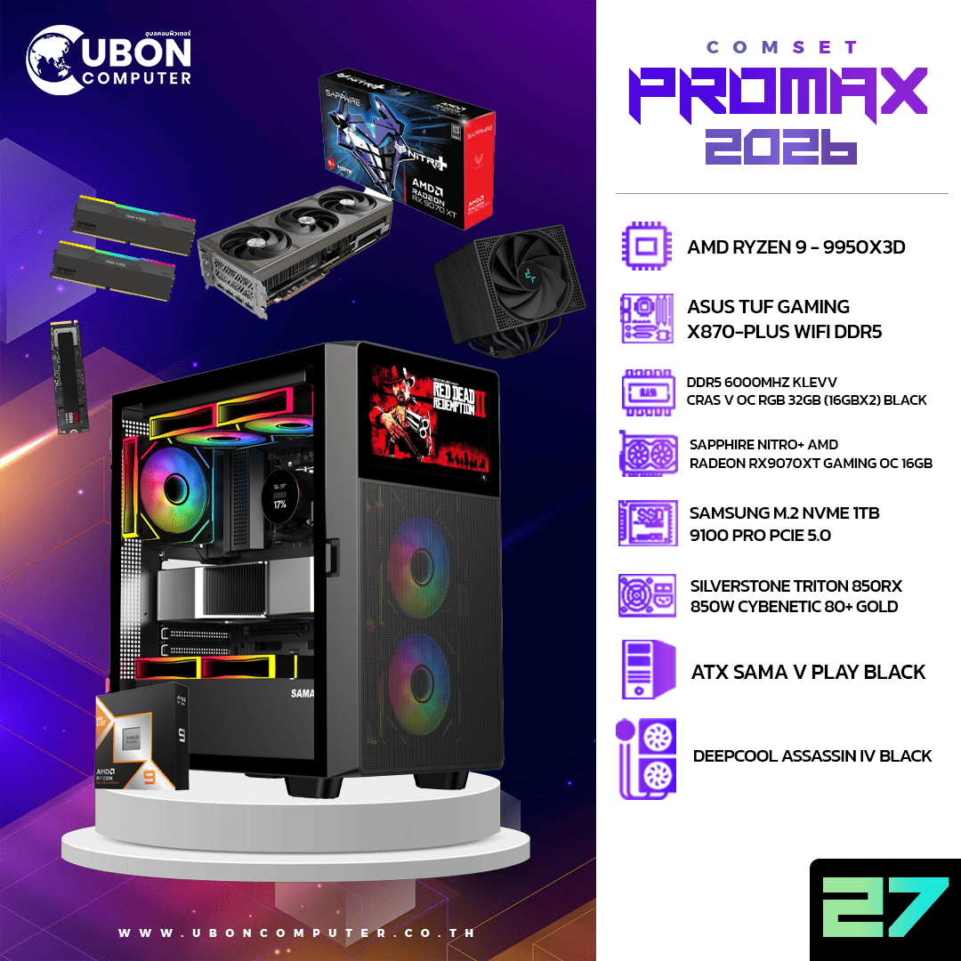 COMSET (คอมประกอบ) PROMAX 27 AMD RYZEN 9 9900X3D / RX9070XT OC 16GB / DDR5 6000MHZ 32GB / M.2 1TB / 850W CYBENETIC 80+