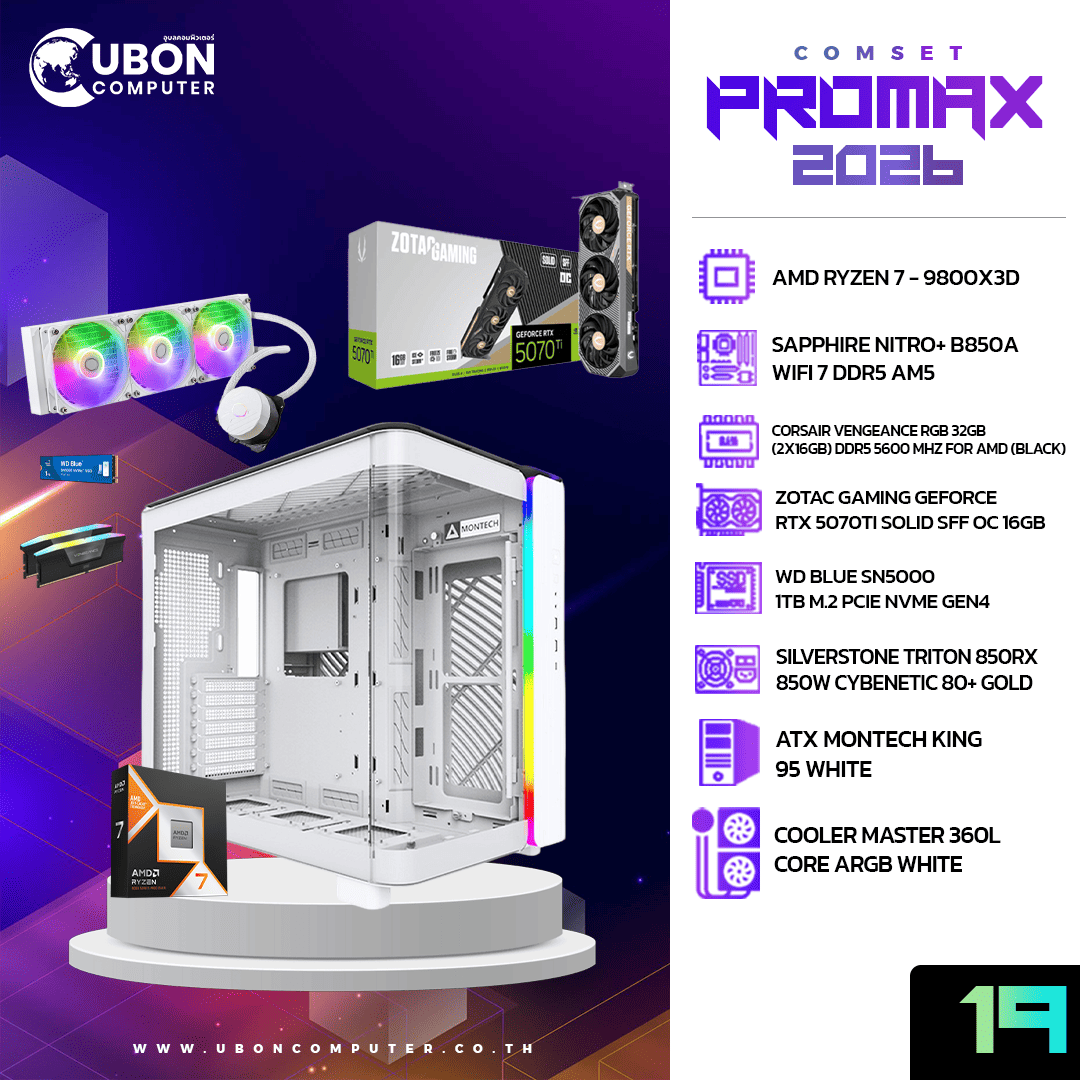 COMSET (คอมประกอบ) PROMAX 19 AMD RYZEN 7 9800X3D / RTX5070Ti OC 16GB / DDR5 5600MHZ 32GB / M.2 1TB / 850W Bronze 80+