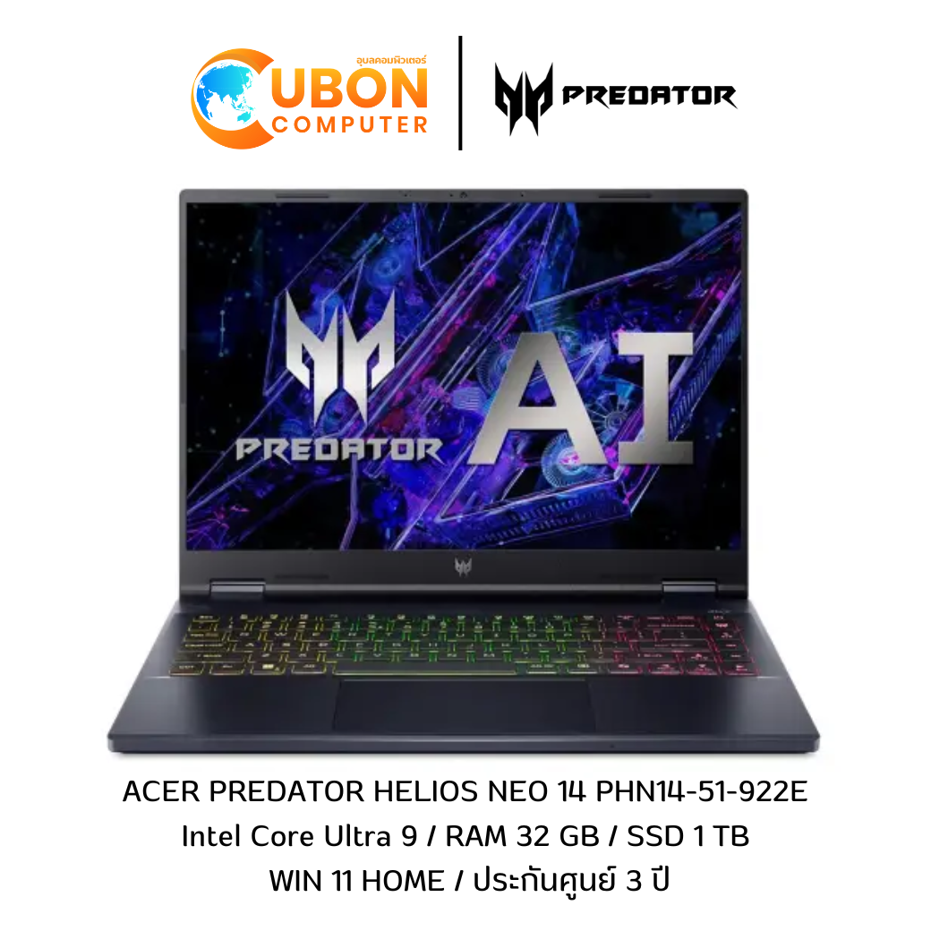 ACER Predator Helios Neo 14 PHN14-51-922E NOTEBOOK (โน้ตบุ๊ค) Intel Core Ultra 9 / RTX 4060 8GB / 32 GB / 1 TB / WIN11 / ประกันศูนย์ 3 ปี